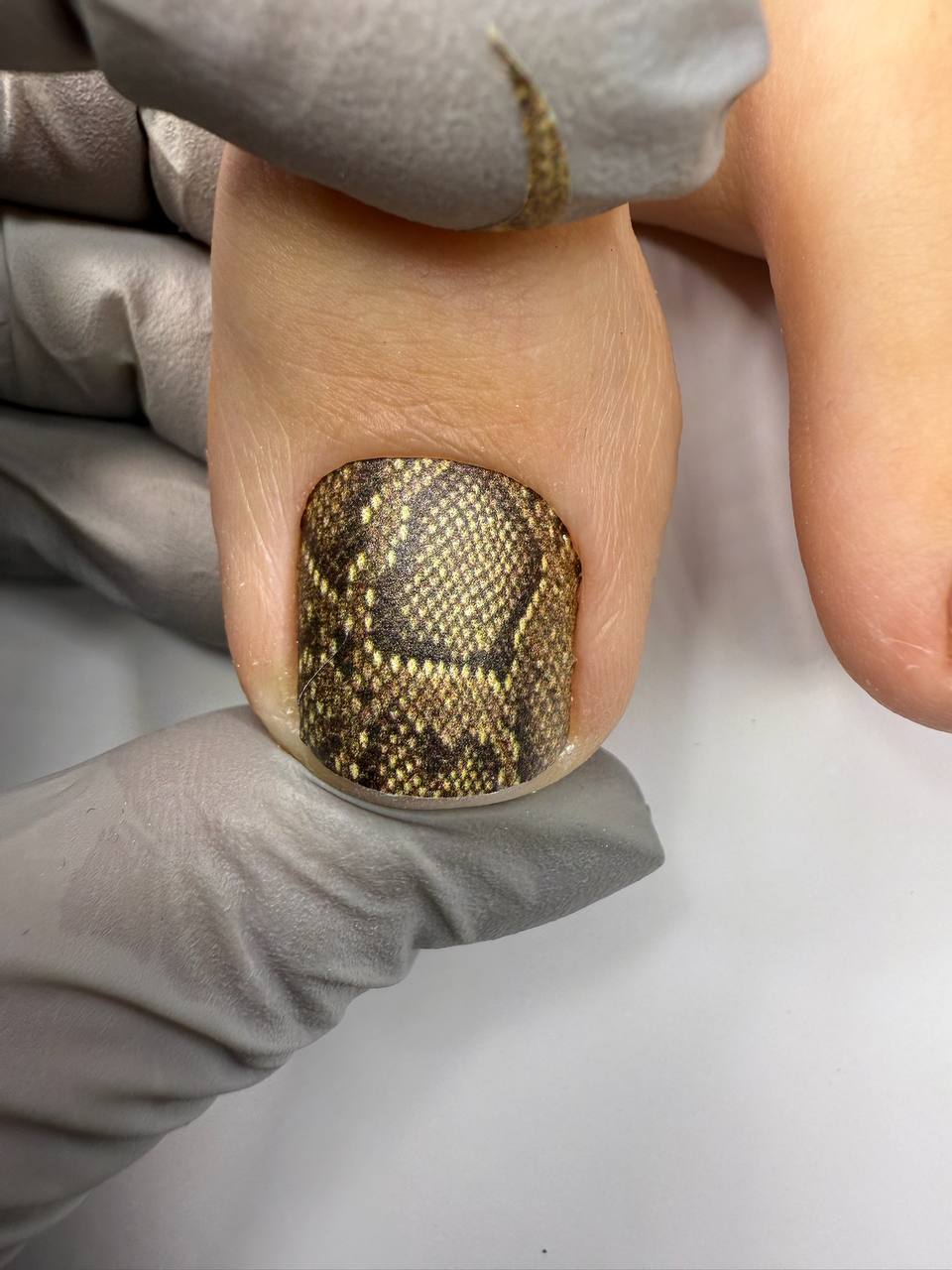 6. Відтягніть іншу сторону вбік і вниз, зріжте зайве в синусі та заправте плівку під кутикулу паличкою.
