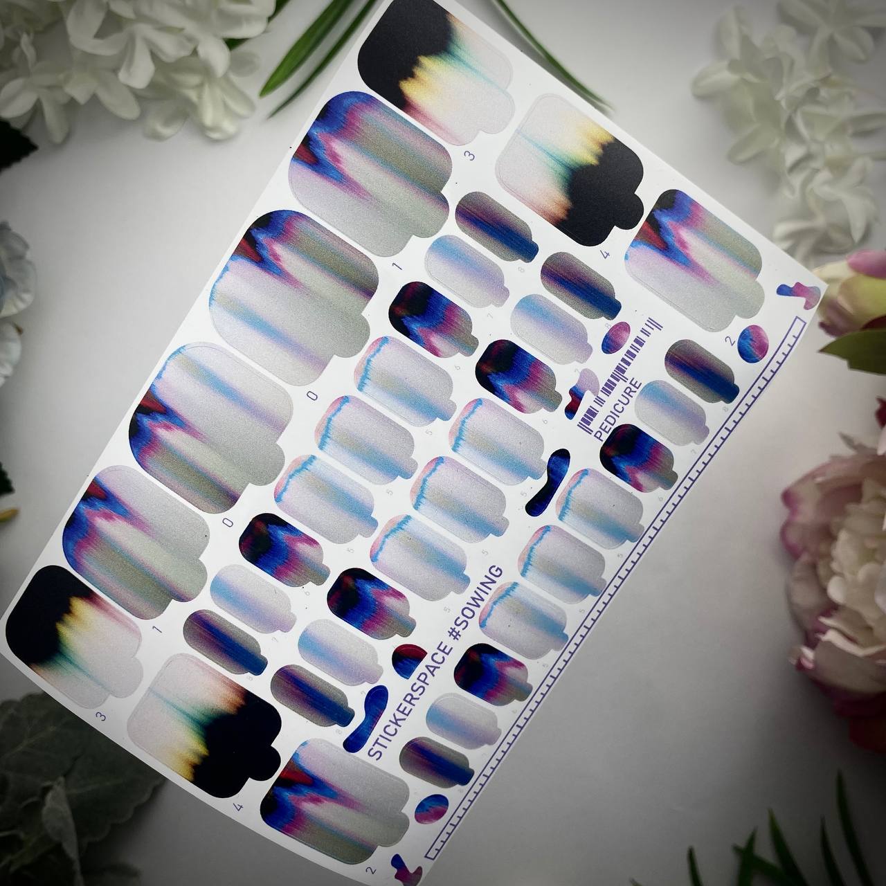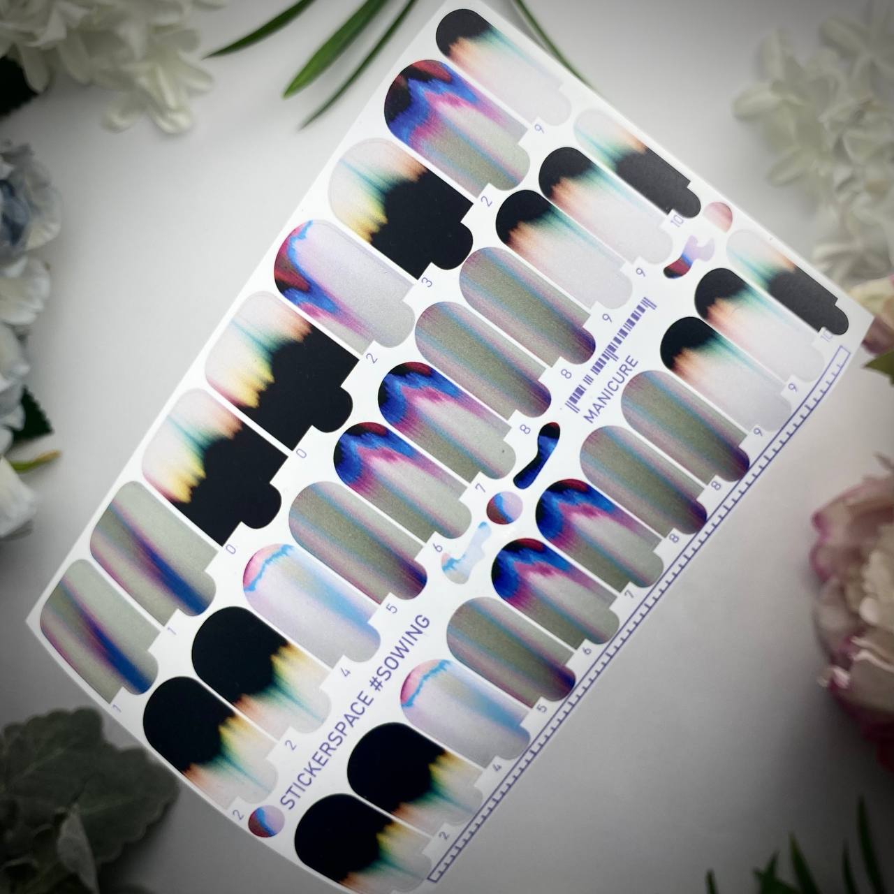 Набір плівок «Sowing» містить 30 плівок різних розмірів, що дозволяє зробити три повних манікюри по 10 нігтів кожен. У комплект також входить лінійка для вимірювання нігтьової пластини.