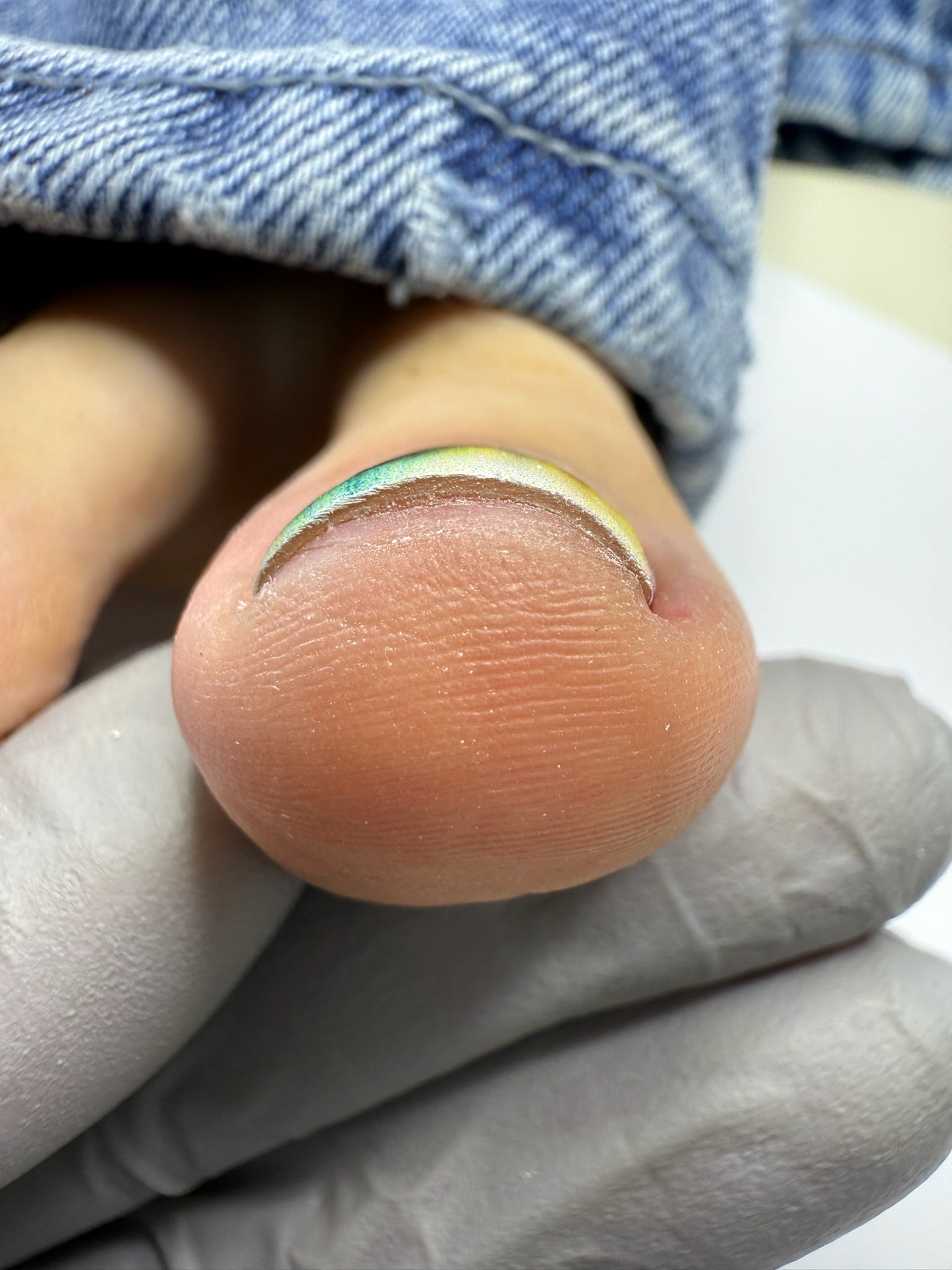 6. Відтягніть іншу сторону вбік і вниз, зріжте зайве в синусі та заправте плівку під кутикулу паличкою.